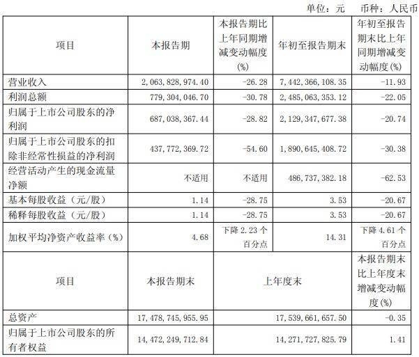 片仔癀第三季度营业收入为20.64亿元,同比下降26.28%,归属于上市公司股东的净利润为6.87亿元,同比下降28.82%。年初至报告期末,公司营业收入为74.42亿元,同比下降11.93%,归属于上市公司股东的净利润为21.29亿元,同比下降20.74%。